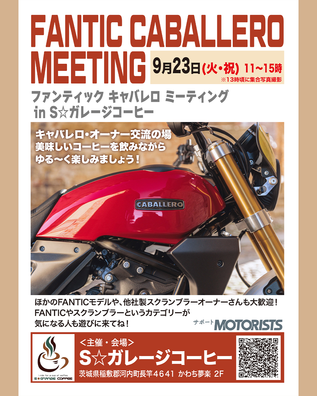 祝日の9月23日(火・秋分の日)、茨城県河内町の「S-ガレージコーヒー」にて、イタリアンブランド「FANTIC(ファンティック)」の人気モデル「CABALLERO(キャバレロ)」をテーマにしたイベントが開催される。ツーリングがてら立ち寄れる気軽さもあり、スクランブラー好きにとって見逃せない一日になりそうだ。