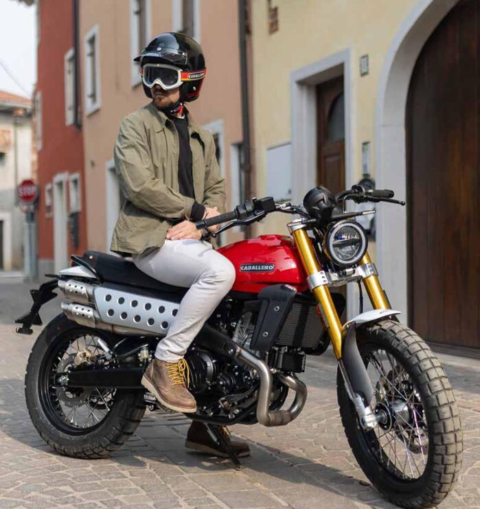 CABALLEROが属する「スクランブラー」とは、オンロードとオフロードの両方を気軽に走れるよう設計されたカテゴリー。アップタイプのマフラーやブロックパターンタイヤといった装備が特徴的で、クラシカルでありながら遊び心にあふれたスタイルが魅力である。近年は各メーカーからもスクランブラーモデルが登場しており、バイクファンの注目を集めるジャンルとなっている。