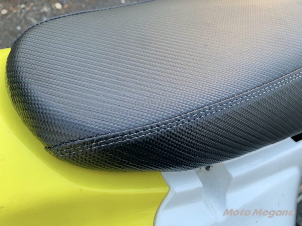 「SDGのコンプリートハイシートの表皮は表面に突起がある滑りにくい素材。オフロードをガンガンに走るのならシートのホールド性は高いほうがいいのですが、ツーリングメインなのでそこまでの耐滑性は望んでいません。見た目を優先して表皮にはカーボン柄を選択しました。