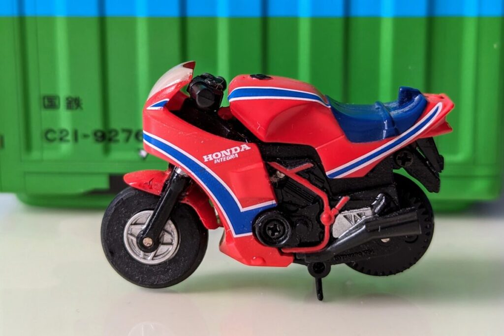 1991年には車名を「XELVIS」に変更。しかし変わり果てた姿に「あんた誰?」という状態に!1998年に「VTR」という昔の名前で再デビューしましたが、排ガス規制に対応できず、2017年にその歴史に幕を下ろしました。このチョロバイは、1982年に発売された2代目(MC08型)です。ビキニカウルからフルカウルに変わり、「インテグラ」のペットネームが与えられました。「かっこインテグラ」でおなじみの四輪のインテグラは1985年の発売なので、こちらが最初です。
