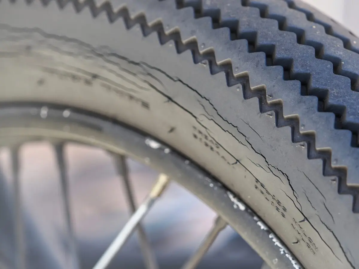 バイクやクルマのタイヤには、経年劣化によってひび割れが発生する