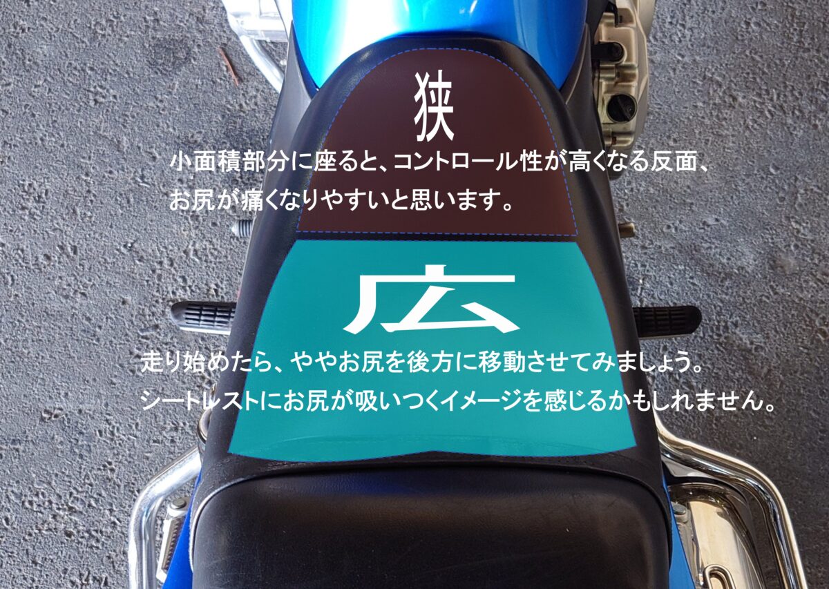 走行状態に合わせ、乗車位置を前後にずらしてみましょう。シート幅は一般的にタンク側が狭く、テール側が広くなっています。幅が狭い位置に乗車するとお尻が痛くなる傾向になります。ずっと同じ乗車姿勢では、安定を図ることはできないのです。