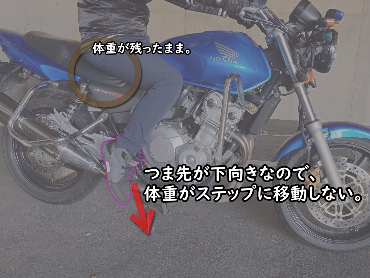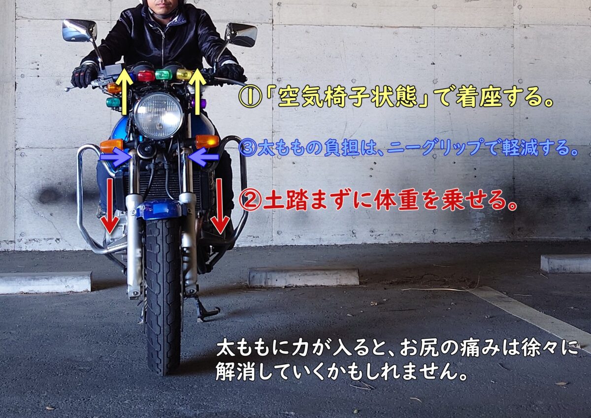 今まで二輪教習を担当した経験から足元……つまりステップバーへ体重を分散させることが「楽な運転姿勢」を作る第一歩だと考えています。運転中に足とステップの位置が定まらないかたは「お尻バランス」の運転になっているかもしれません。すると痛くなりやすいのです。