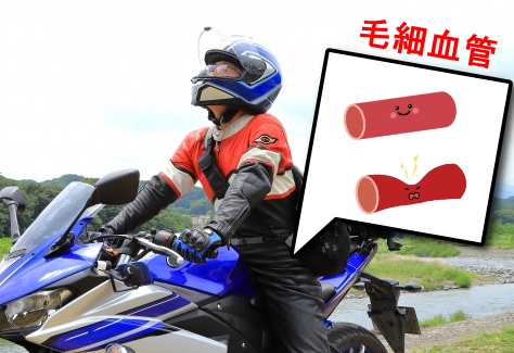 この狭い座面に乗車するわけですから、ライダーの全体重が狭いシートに集中することになります。一方、私たちのお尻には隅々まで「毛細血管」が通っており、力が継続的に加われば血流が悪くなっていきます。すると、血流の悪化によってお尻の筋肉や神経が圧迫……。