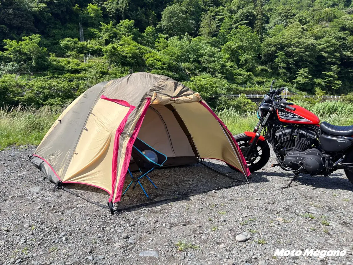 現地到着した段階でバイクで走って疲れているので短時間で設営できる点も大事