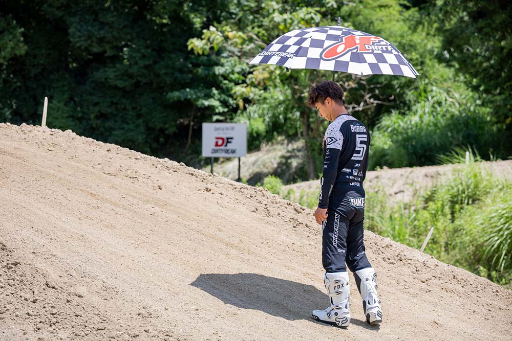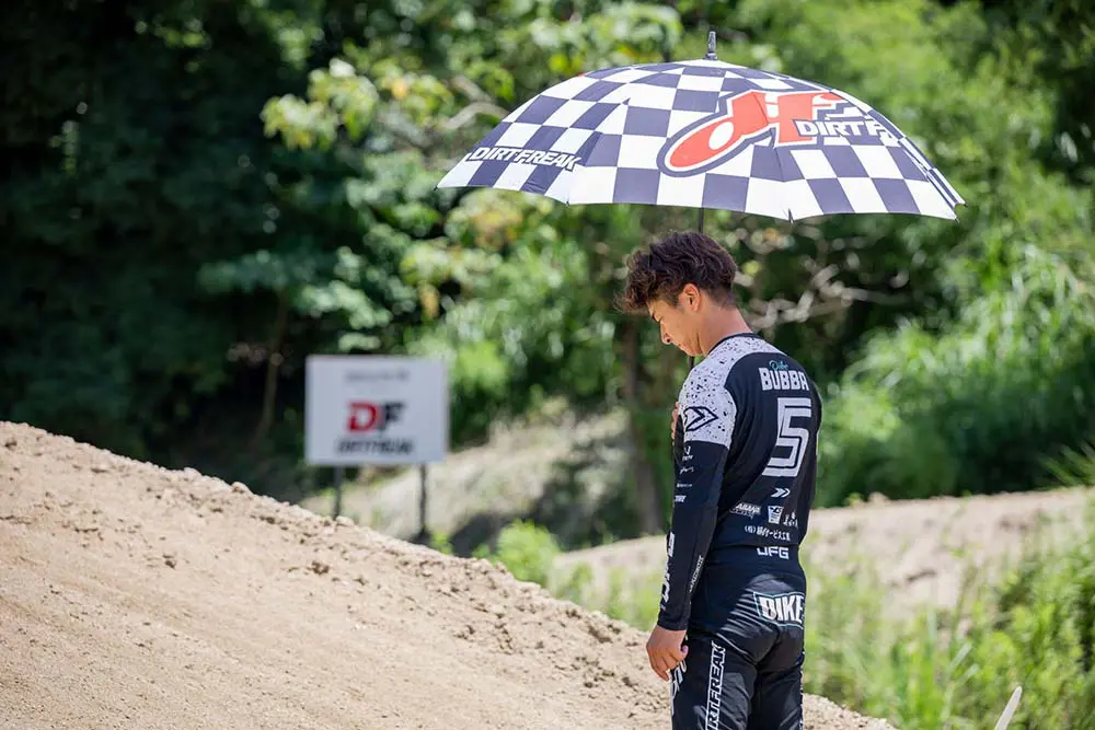 ライダーはスポンサーやメーカーの傘を使用している人が多くいます。もちろんダートフリークのアンブレラもあります。店舗やオンラインはもちろん、全日本会場などでも販売しているのでチェックしてみてください。