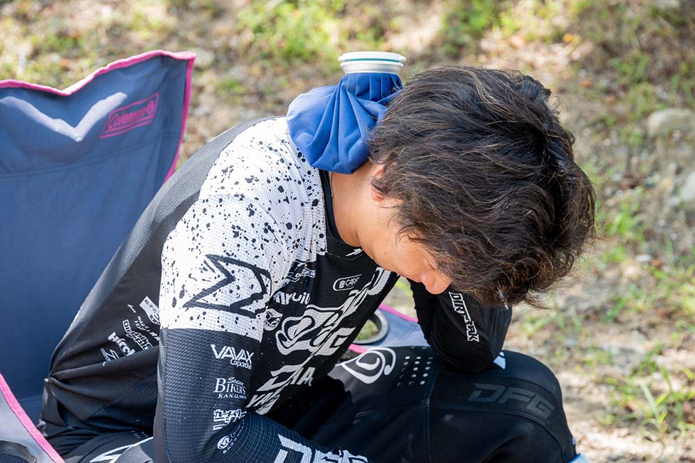 「モトクロスはレース中に身体を冷やすということは難しいと思いますが、たとえば冷感インナーを着用することで走行中も涼しさを感じることができると思います。また、レースが始まるまで体力を温存するという点で、日傘を使用して涼しさを確保したり、氷嚢(ひょうのう)やネッククーラーで首を冷やしたり、ファン付きベストや冷感ベストで体温を上げないように対策することも効果的です。一方、エンデューロでは余裕があれば休憩したりピットインすることが可能ということで、休憩時には冷水を浴びたり、クーラーをつけたトランポの中で涼んだりと身体の火照りを抑えることが大切です。長時間のレースのなかで”こまめに”身体をケアすることを意識してほしいです」(泉澤さん)