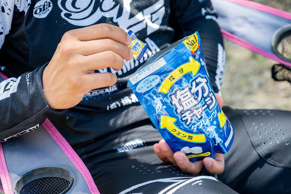 水を飲むペース配分も気をつけていて、夏はレースの最初の1時間で水を結構飲むように意識してます。レース後半は身体がつりやすくなるんですよね。喉渇いて身体つりそうと思ってから飲んでももう手遅れなので、かなり意識的に、前半の1時間までにこまめに水分補給しています。というのも、前に、レース中にハイドレーションの飲み口が取れてどこかにいっちゃった時があって、ピットインした時に水分補給してまたレースに出ていくことで対応したのですが、レース後半は全然身体が動かなかったんですよね。水分が不足するとどれほど身体が動かないかというのを身をもって経験しているので、水分補給は意識的にやってます」