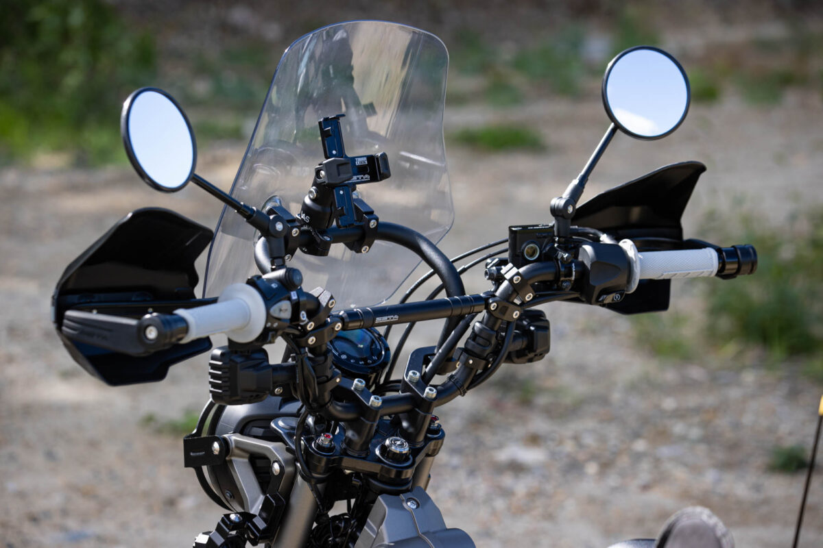 スクリーンとモバイルマウントが一体となったスクリーンキット。防風効果の高いラージタイプを採用し、ツーリングの快適性を向上。