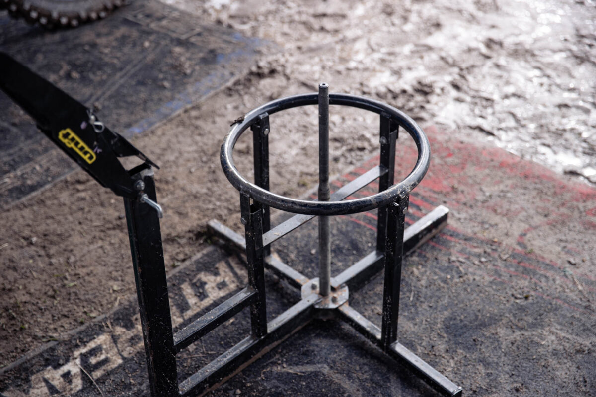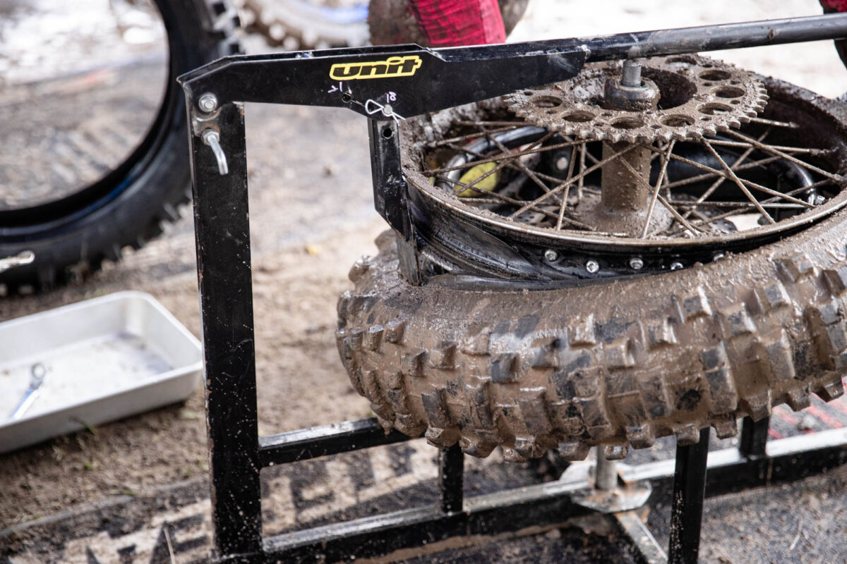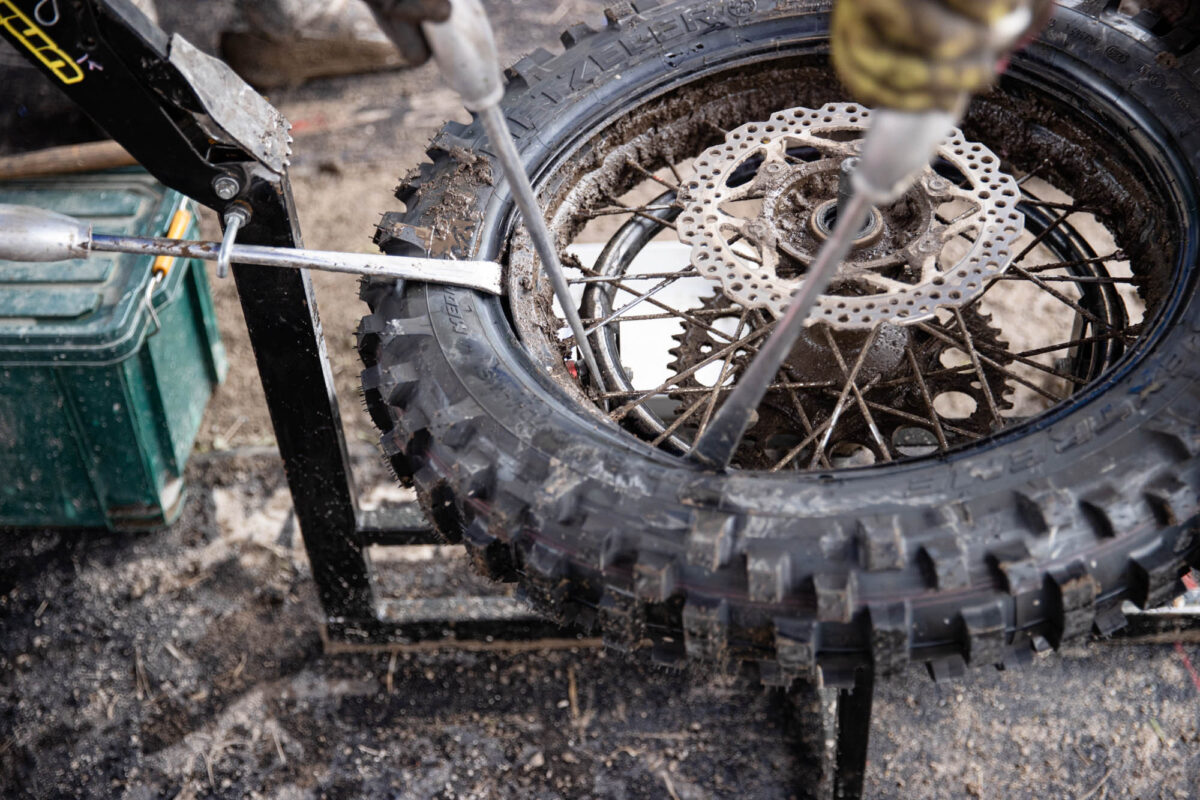 バイクを置く場所はエンデューロの規則で環境保護マットを使用すること、と定められています。また、タイヤ交換をするので当然センタースタンドにバイクを載せなくてはいけません。急いで交換作業をするため、無用なトラブルを避けられるようリフト式のスタンドは避けたほうが無難ですね。また、スタンドの脇にはアクスルシャフトを外せる工具をトレイに入れて用意しておきます。使う工具はすべて用途に合わせてわかりやすい場所に置いておくのが基本です。なお、今回はムースを新品タイヤに入れ替える作戦だったため、タイヤを外してからでないとムースを新しいタイヤに入れられなかったのですが、できればムースはムースグリスを塗って交換するタイヤに仕込んで準備しておきたいところです。