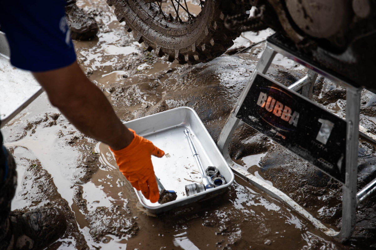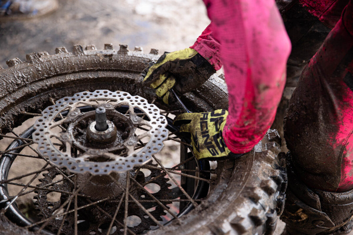 バイクにホイールを組み付けます。今回はマディコンディションだったこともあり、バイクに泥が付着しているため非常にやりづらいところです。馬場選手のバイクは、アクスルナット付近に泥が付いていたので、これを掃除しながら装着することになりました。ちなみに、アクスルブロックは純正と違って向きがわかりやすい、ZETA RACINGの製品を使用していたため、こういった煩雑な状況でも迷わず取り付けできました。