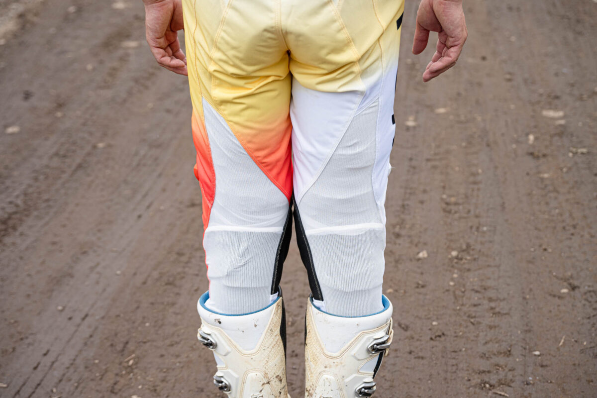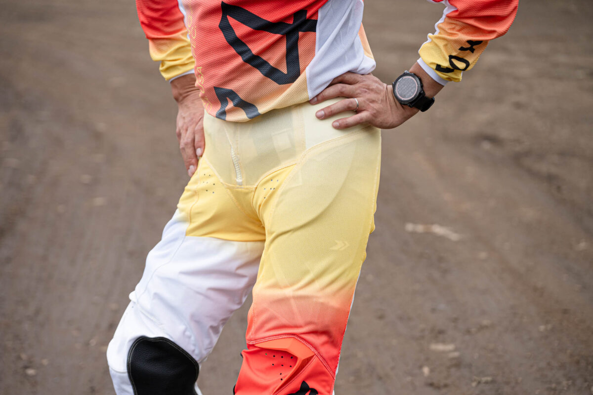 さて、それでは本題のFOX180エアーで走ってみましょう。走り出した瞬間にこれは違うなと感じるほどの通気性です。上半身も、下半身もしっかり通気性があるのがよくわかります。冬にこれで走ったら、身体が温まらないかもしれませんね。とにかく涼しさが際立っています。着心地ですが、180ベースなのでそこまで伸縮性は高くありません。筆者は街着で32インチのパンツを履いていて、モトクロスでは流行に即してぴったりサイズの30インチを履いているのですが、今回テストには28インチのパンツを使用しています。太もも周りがパツパツなのですが、それでも涼しさは段違いでした。