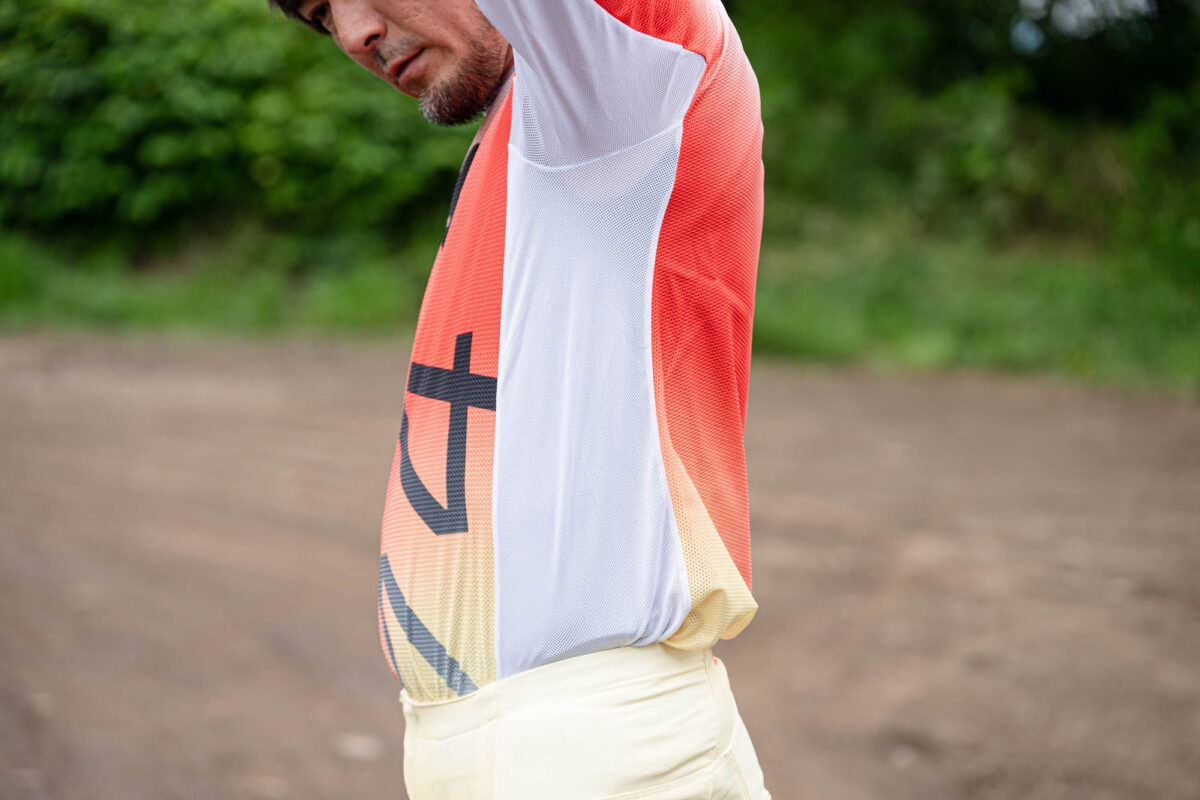 まずはジャージを見てみましょう。どのパネルも目の粗いメッシュで作られており、インナーなしでは恥ずかしさを感じるくらい透けてしまいます。素材はフレックスウエアのような伸縮性に特化したものではないものの、必要十分な着心地です。