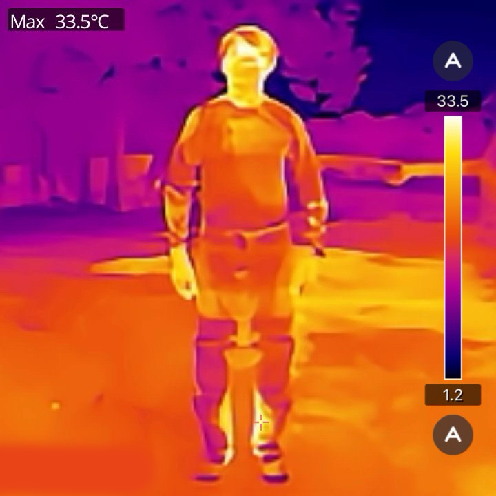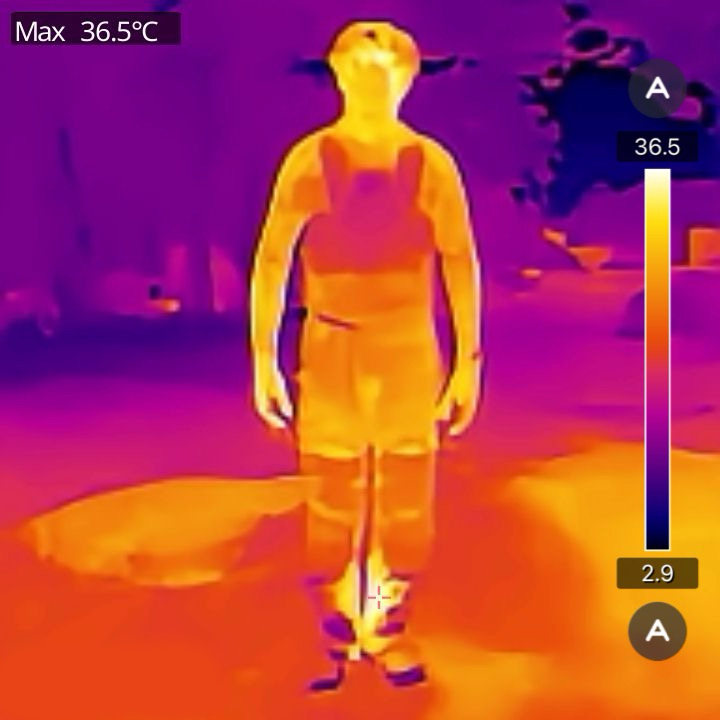 サーモグラフィを見てみましょう。色が濃いところは温度低め。薄い黄色の部分が高めで、最高36.5度と出ました。上半身、下半身ともにまんべんなく熱がこもっているのがわかります。激しい運動のあとなので、当然暑いですね。