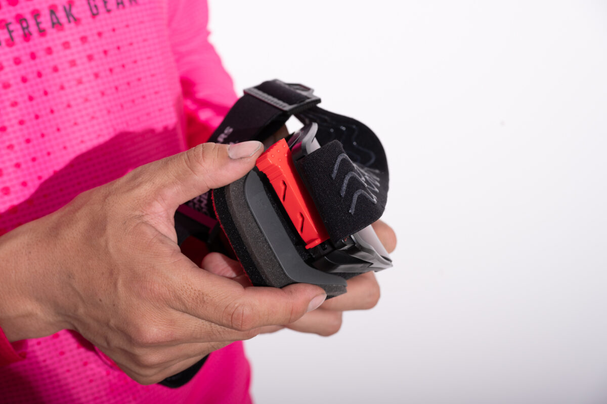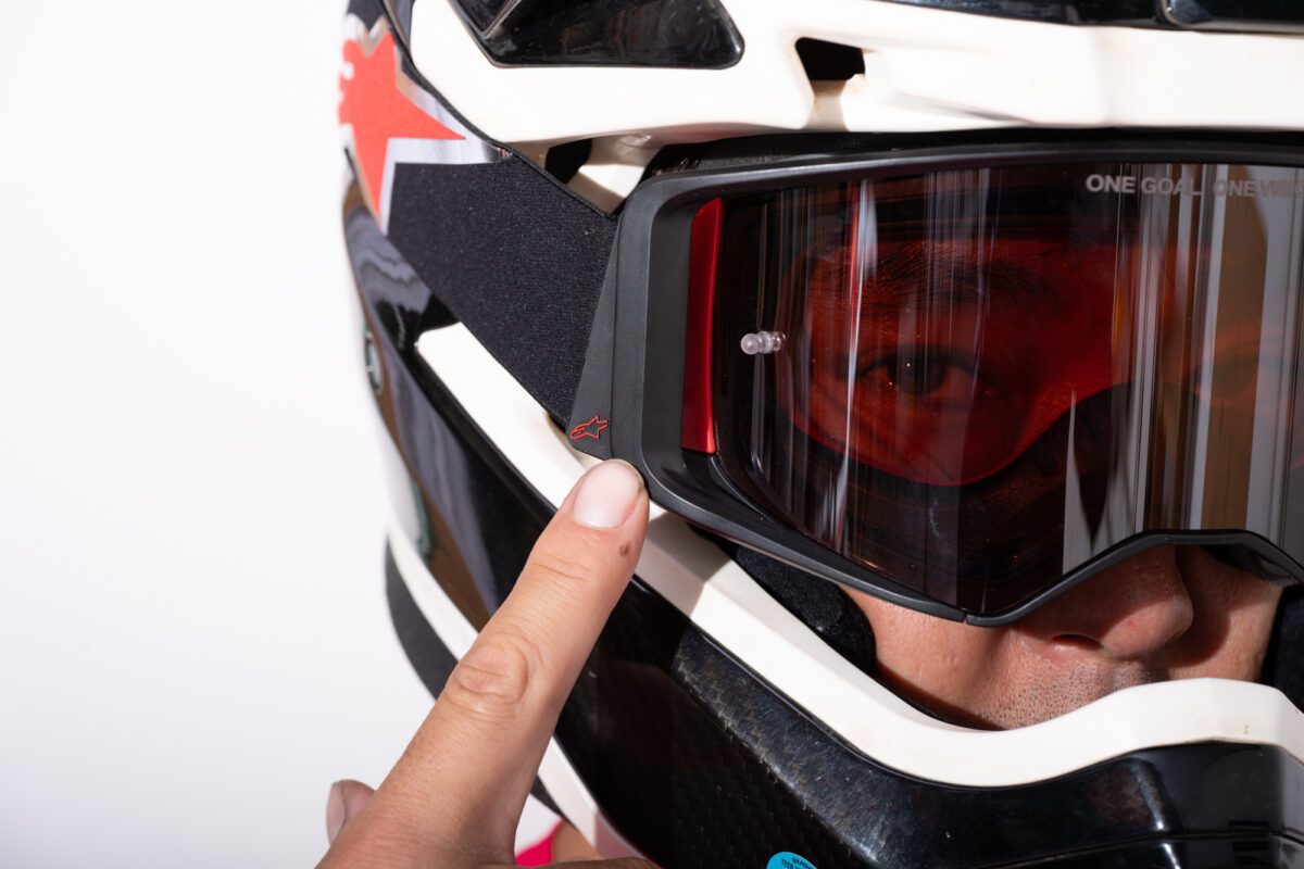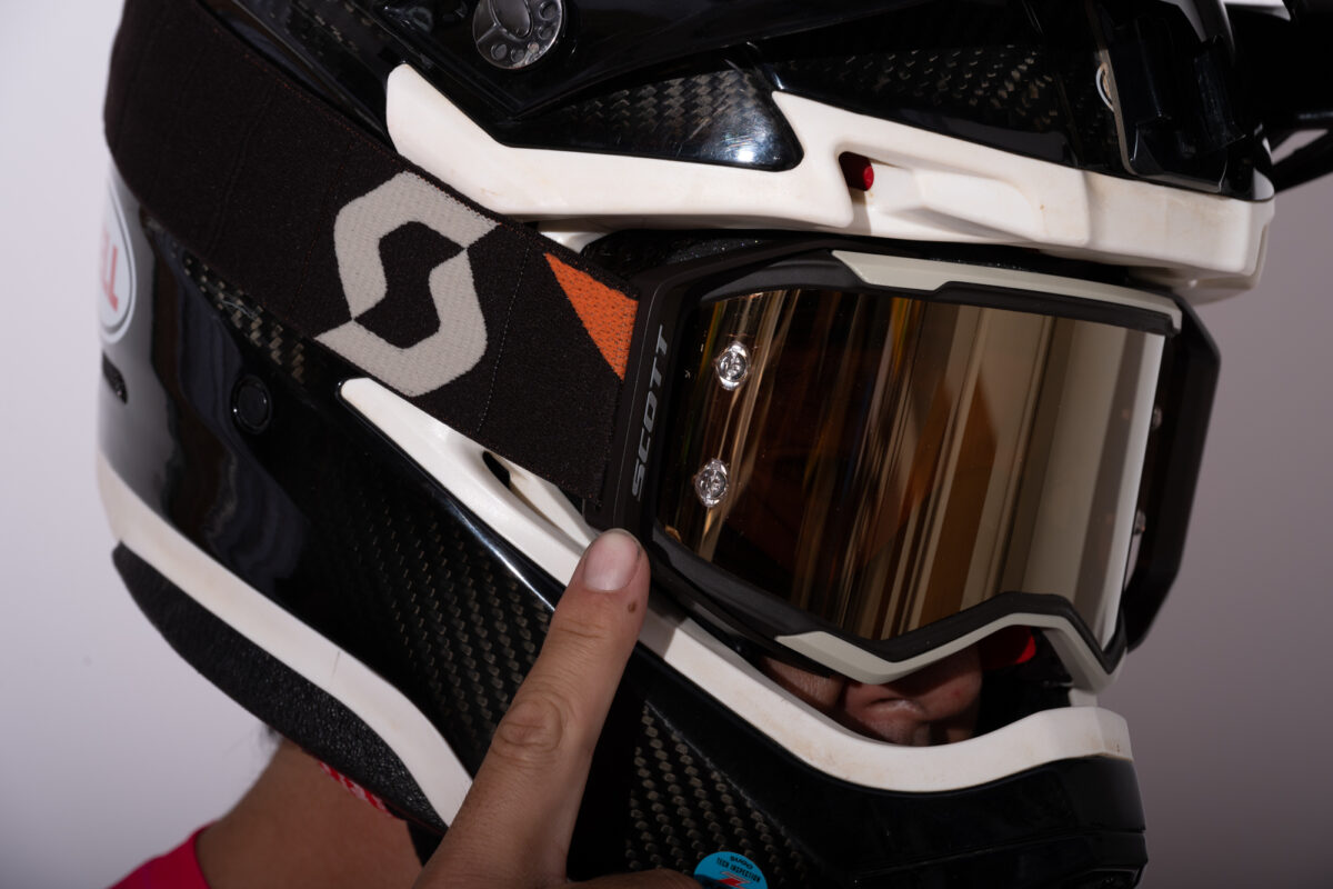 大倉選手に話を聞くと「僕は 雨・泥・砂埃、どんな時でも視界を守るためにゴーグルは外したくないので、レースではティアオフを3セットほど重ねるのが標準装備です。重ねる枚数が多すぎると視界が見えにくくなるリスクもあるのですが、レースの途中で無くなったという事態は絶対に起きて欲しくないので、多めにつけています。また、なるべく消費量を抑えたいので、ティアオフに泥がついても、隙間から見えるところを探して、もう見えなくて無理だとなるまでかなり粘って使っています」と、ティアオフを好んで使っているそう。
