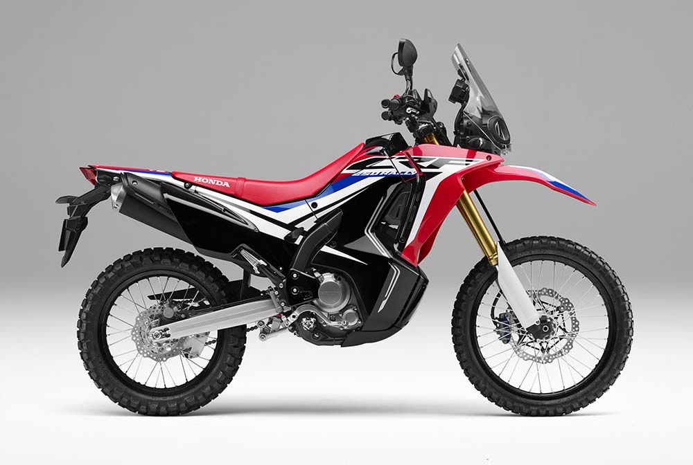 オフロードモデルのCRF250Lをベースに、ダカールラリーで活躍するCRF450RALLYをイメージしたアドベンチャーモデル。前21インチ、後18インチのホイールサイズと高い最低地上高をもち、オフロード性能はアドベンチャーとしてはピカイチ。小排気量ということもあり、これならばどんな林道でも恐れずに入っていくことができます。前後サスペンションの長い<s>タイプもラインナップしています。