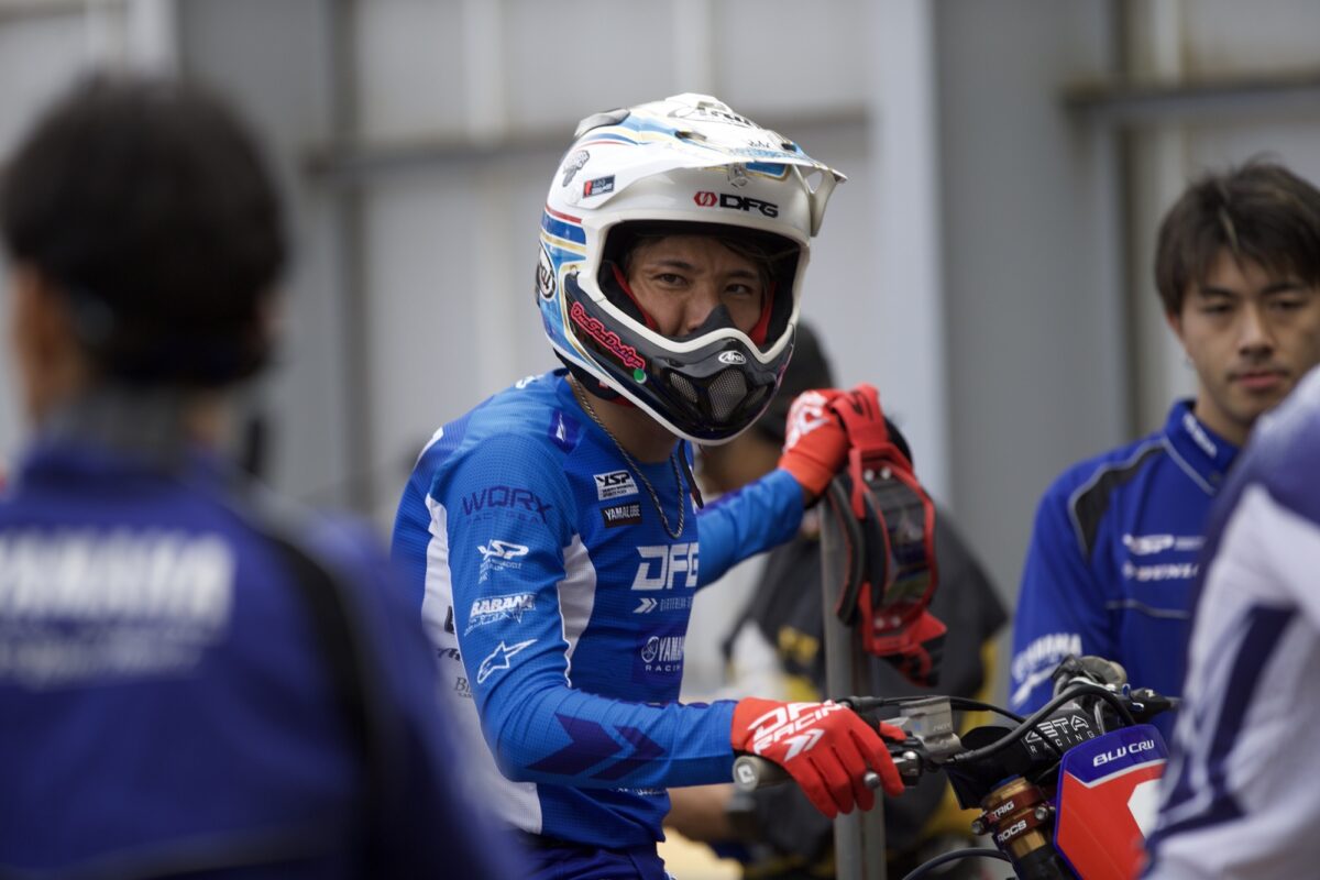 「DFGのワークスウエアは単色なので、例えばブルーは当然ですが青の主張が強いため他のアイテムは違う色で合わせました。僕が乗っているマシンはヤマハなので、全体的に青く、ウエアとの相性も良いです。ただ、ナンバープレートは赤なんです。この赤の面積が意外と広くて、全体で見た時に目立つので、グローブとゴーグルはこれに合わせて赤を選んでいました。ヘルメットは黒と白のもの、ブーツは白を合わせました。青色が入ったヘルメットもあるのですが、マシンもウエアも青なので、トータルバランスを考えながら組み合わせました」(大城)