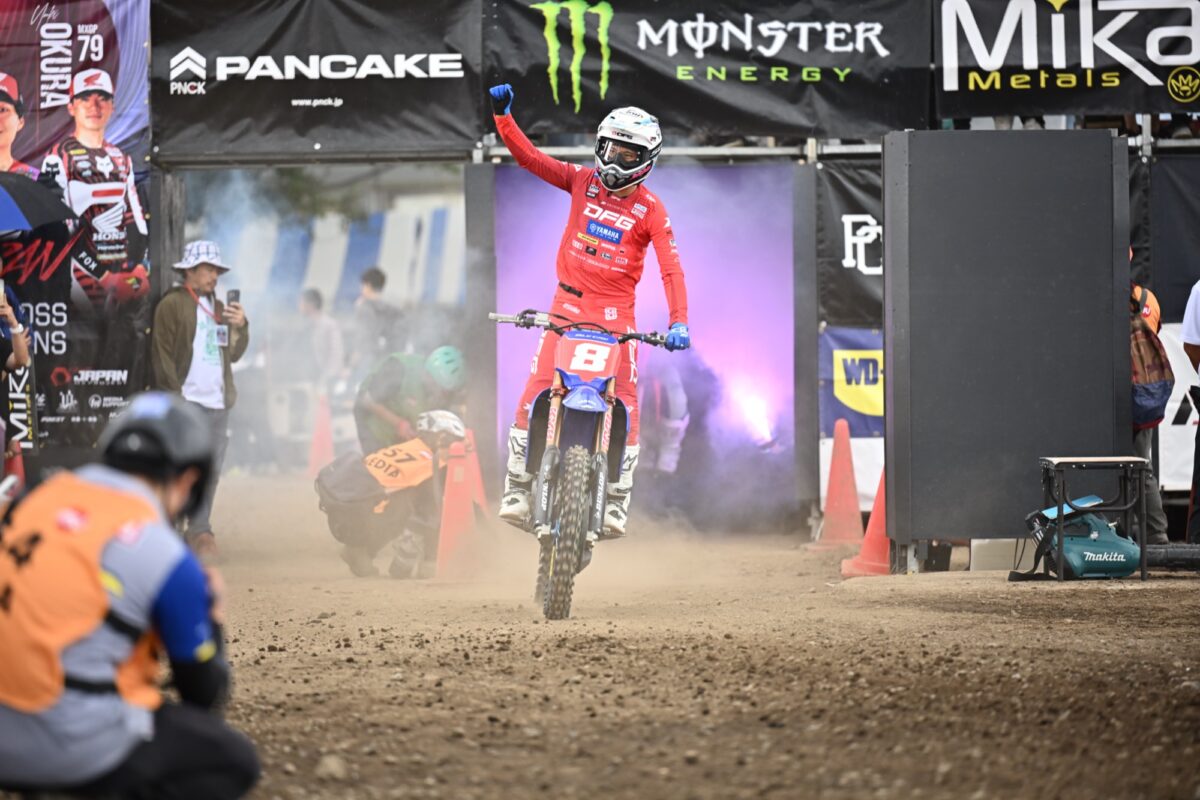 「最終戦ではDFGワークスウエアの2026年モデルを着用しました。青と赤は2025年モデルにもありましたが、2026年モデルにはサイドに白が入っていて、印象がだいぶ変わったと思います。あと白黒にワンポイントでゴールドが入ったデザインもあって、それが一番評判が良かったですね。