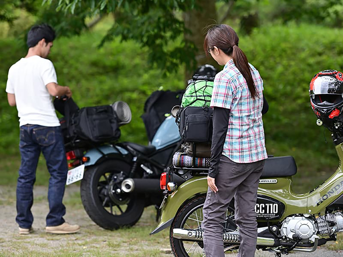 シートバッグ・ツーリングネット荷物をバイクに車載するためのアイテム。リュックをずっと背負い続けるのは負担も大きいため、車載できると身軽でいられる。