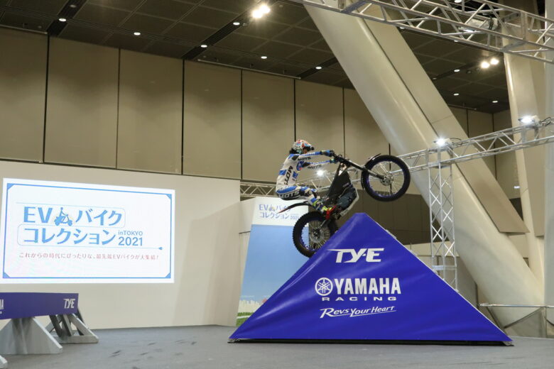 イベントでは各メーカーの最新EVバイクの展示をメインに、ステージではさまざな催し物が行なわれました。電動トライアルバイク「YAMAHA TY-E」を使ったトライアルライディングショーでは、全日本トライアル選手権シリーズの最高峰クラスで戦っている黒山健一選手が登場。ウイリーやジャックナイフから始まり、ステージ上に造られたかなり急な斜面も難なくクリアするなど、トップライダーの繊細な操作に対応する電動トライアルマシンが持つモーターの出力を制御する高い技術と走破性を披露してくれました。