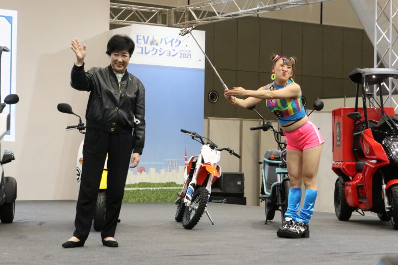 また、フワちゃんと小池東京都知事によるトークショーも実施。小池都知事は環境問題とモビリティのEV化の重要性、個人一人一人が環境を意識した行動の大切さを訴え、フワちゃんは普段から原付バイクに乗っていることもあり、EVバイクにも高い関心を示していました。