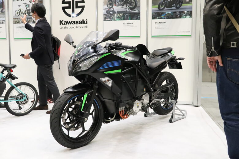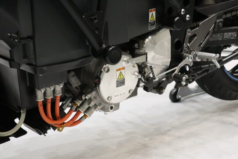 EVプロジェクトはEICMA 2019で突如発表されたEVスポーツモデル。Ninja650とほぼ同格の車体に制御ユニット、バッテリー、モーターを搭載し、4速リターンのミッションでスポーティな走行を楽しめるというもの。私たちが普段目にしているバイクに限りなく近く、使用する足回りのパーツなども含め極めて現実的な車両です。