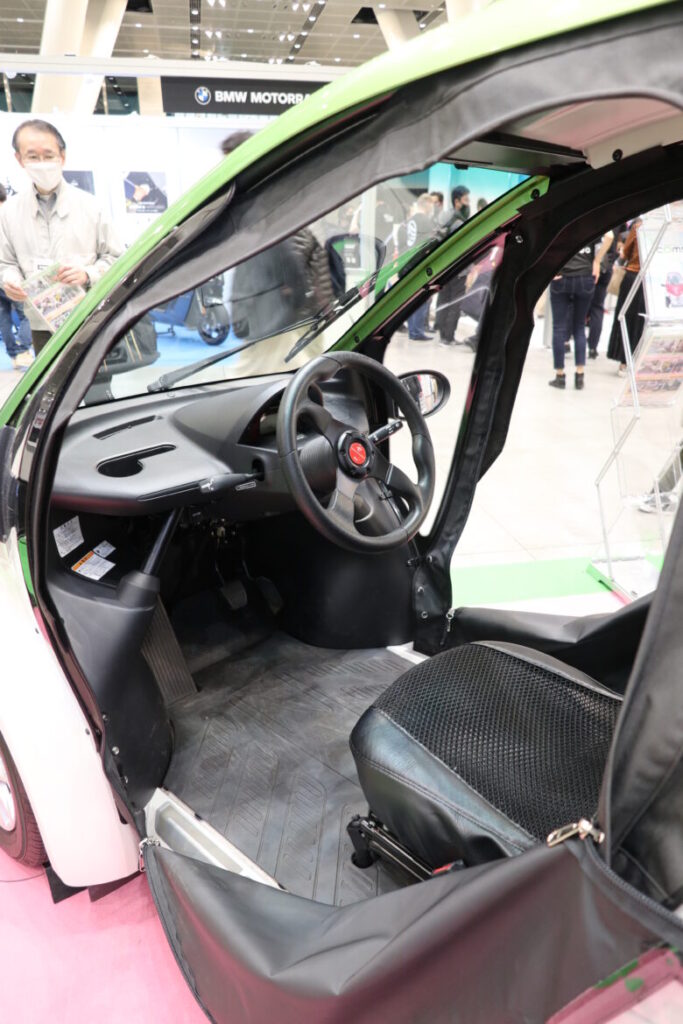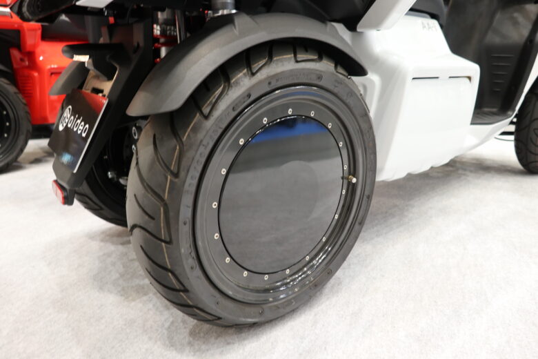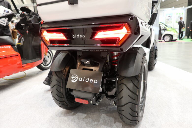 AA-iはイベント内で発表されたニューモデル4輪EVモデル。4輪の安心感と2輪の手軽さを両立し、誰もが乗れるよう普通自動車免許で運転できるミニカー登録となっています。コーナリング時には車体が傾きますが、運転する人が車体を傾けるのではなく、電子制御により速度とハンドル切れ角から最適な角度に傾斜するようになっているのも特徴です。リヤの両輪に組み込まれたインホイールモーターによって駆動し、力強い走りを実現しているとのこと。気になる価格ですが、3輪のAA-Cargoの販売価格(〜1,097,899円)とかけ離れすぎない、現実的な価格となる予定だそうです。