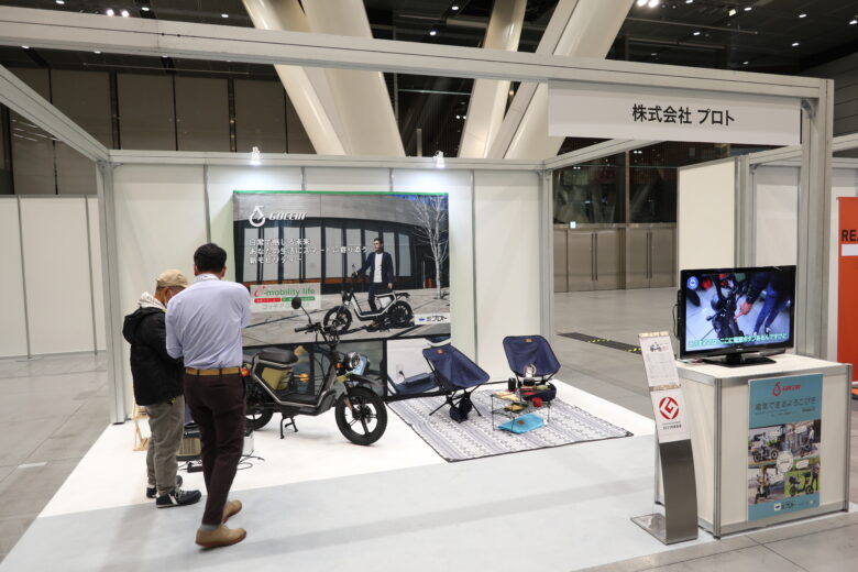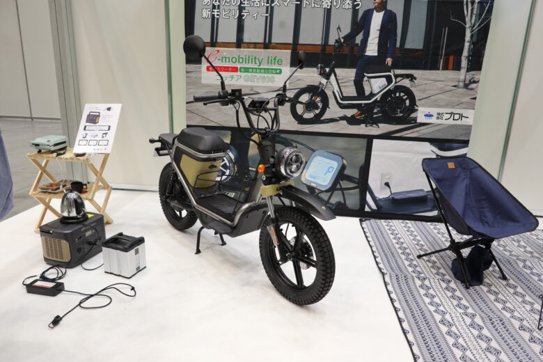 グッドデザイン賞を受賞したGOCCIA GEV600。マンション住いや会社でも充電しやすい取り外し可能なバッテリーを採用し、一充電で約70km走行可能、重量56kgと軽量な車体で、日常での使い勝手が良く考えられているモデルです。それでいて162,800円と現実的で購入しやすい価格設定なのも見逃せません。可愛らしい外観も魅力ですが、アウトドアコンセプトとして展示されていたGEV600TRKが私としては気になりました。可愛らしい雰囲気のGEV600とは一変して、ブロックパターンのタイヤを履いたGEV600TRKはカラーリングと相まって少し無骨な印象。ブーム真っ只中のキャンピングカーに一緒に乗せて、キャンプ場の先で移動する足としても非常に重宝しそうです。なにより車内に乗せてもコンパクトですし、ガソリン車のように車内のガソリン臭で悩まされることもありません!!