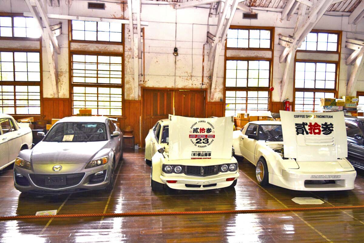 RX-8(2003~2013年)、サバンナ(1971~1978年)、初代サバンナRX-7(1978~1985年)の3台が並んでいます。サバンナはグリルの形状から後期型でしょうか。輸出名から「RX-3」とも呼ばれていました。72年に日本グランプリTS-bレースに出場したときは、日産ワークスGT-Rを撃破し、1位から3位まで表彰台を独占するなど実力を見せつけたらしいですよ(ウィキペディア情報)。
