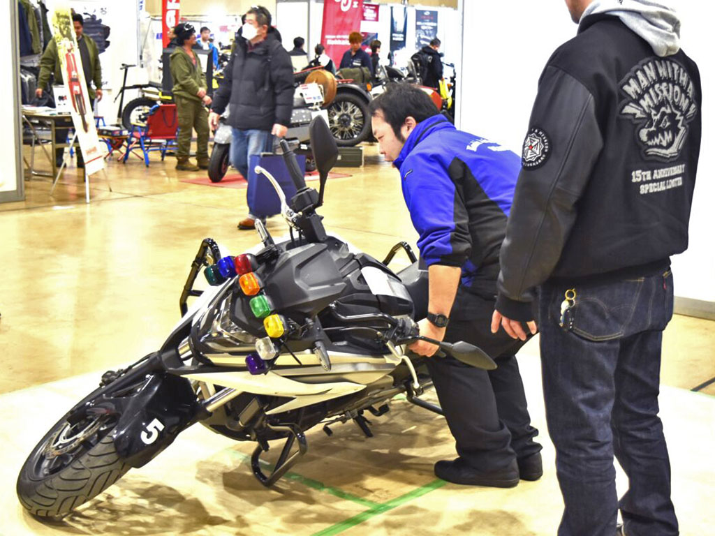 北海道モーターサイクルショウは、「バイクに関するもので、ここにないものはない!」と言うくらい充実しています。「免許を取りたいけど、倒れたバイクを引き起こせるか心配」という人は、JAGE二輪ジムカーナのブースへGO。