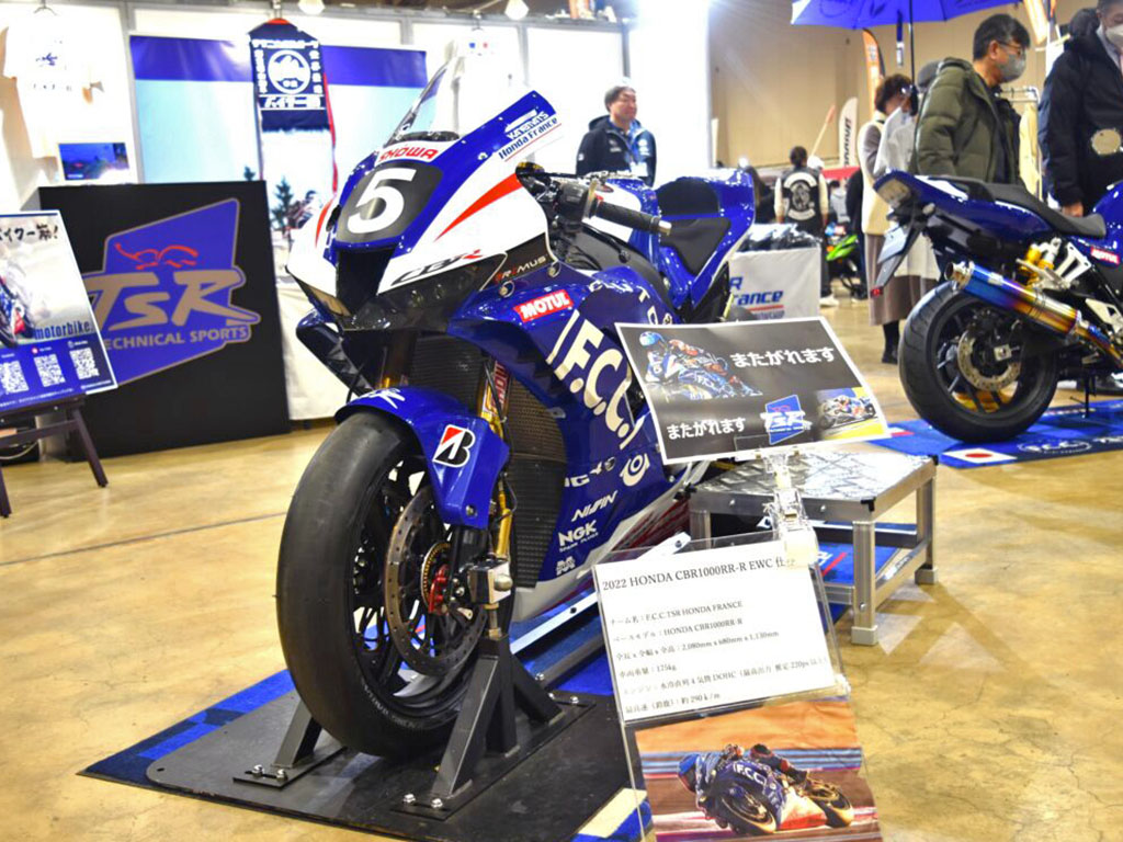 市販車が多い中で「ホンダ・ワードTSR」は、毎年レーサーモデルを出展しています。今年はEWC仕様のCBR1000RR-Rを展示。こんな希少なバイクにもまたがることができます。
