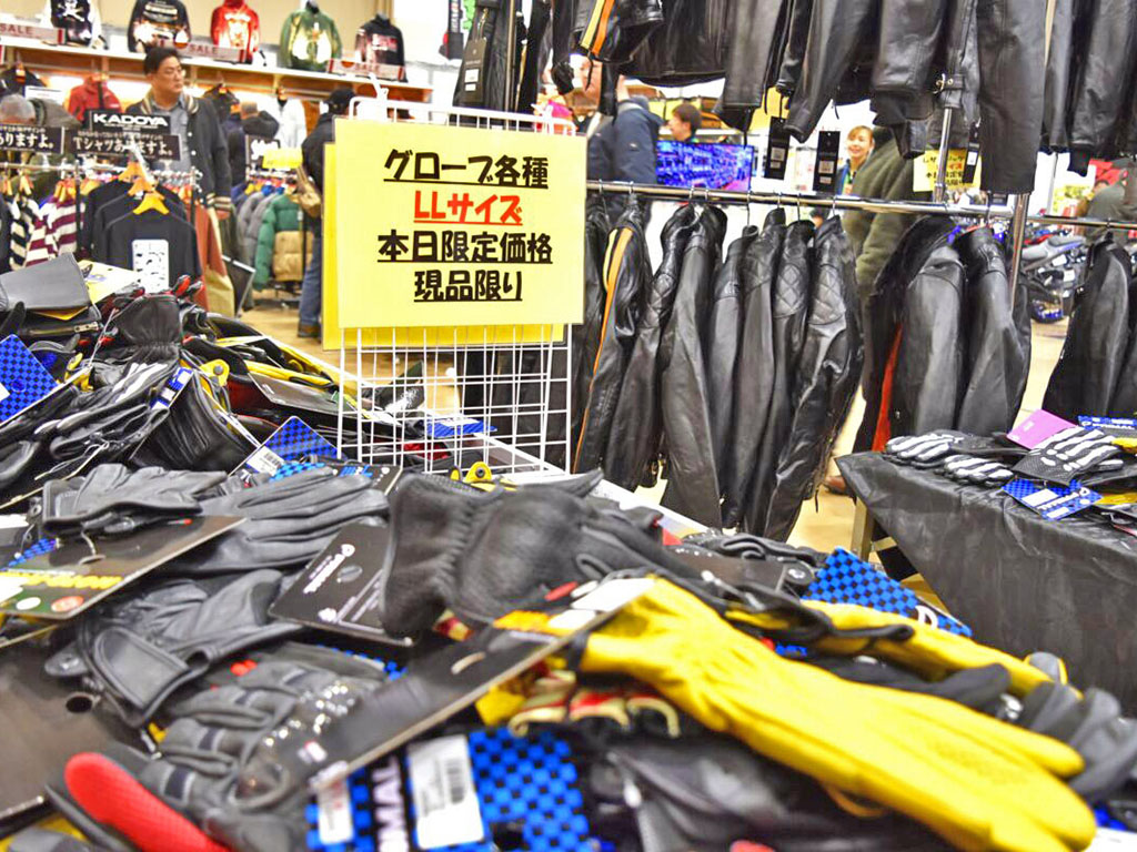 バイクを選んだら、用品も揃えなくては!ヘルメット、ウエア、ブーツなどが、特別価格で販売されています。買い物こそ「ショウ(商)」の醍醐味。私もグローブを購入しましたよ。