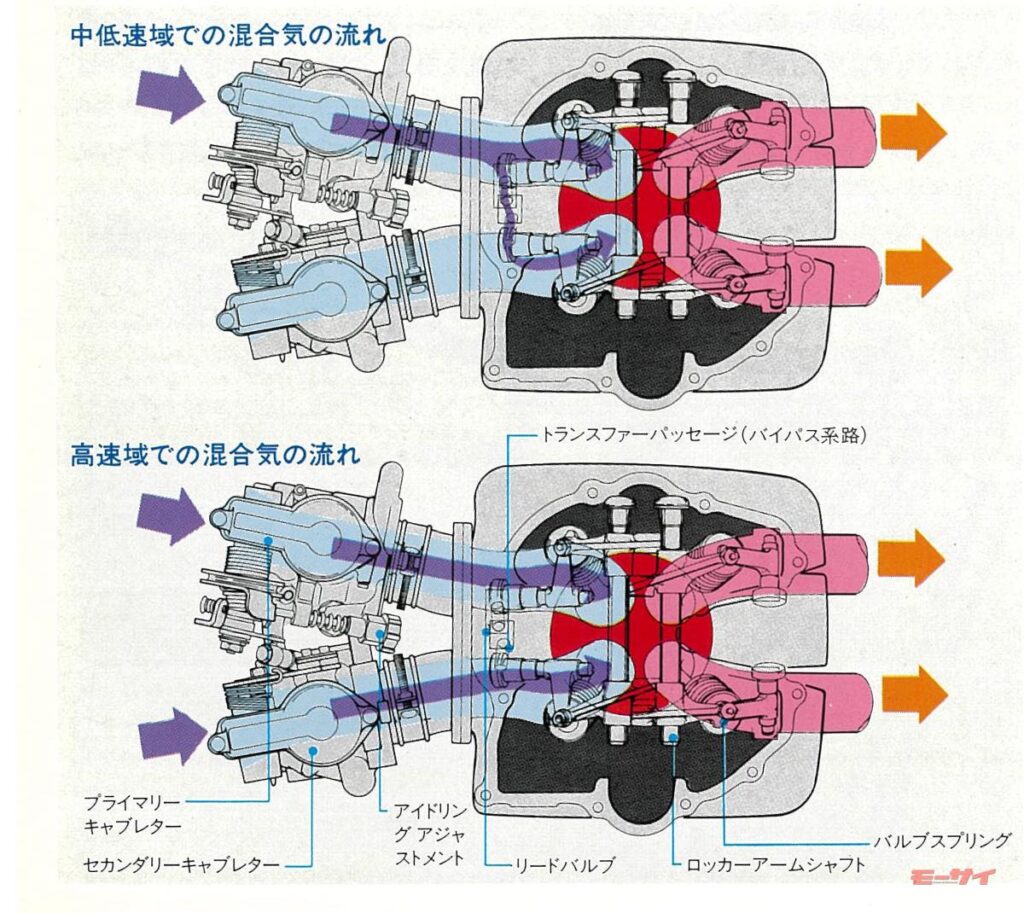 XLX250Rが導入したツインキャブレターは、小口径と大口径の利点を両立。低中回転域では左のみ、高回転域では左右が作動