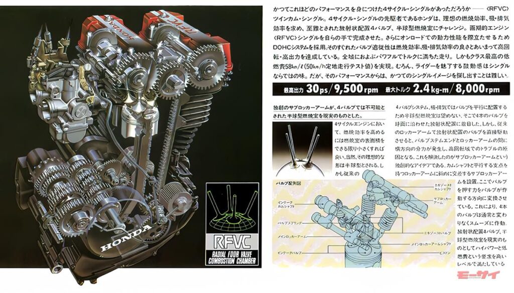 誤解を恐れずに表現するなら、「そこまでやるのか‼」と言いたくなるほど、当時のホンダは4ストローク単気筒の改革に熱心だったのだ。と言っても、1970年代後半~1980年代中盤の同社を代表する革新的なエンジンと言ったら、V型2気筒とV型4気筒のイメージが強いものの、単気筒にかける意気込みも相当以上だったように思う。