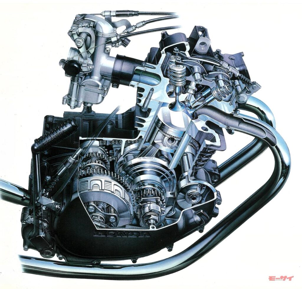 また、吸気通路のストレート化を実現するため、2つのキャブレターを平行に配置したことも、CBX250RSのパワーユニットの特徴である(XLX250Rのキャブレターはハの字で配置)。