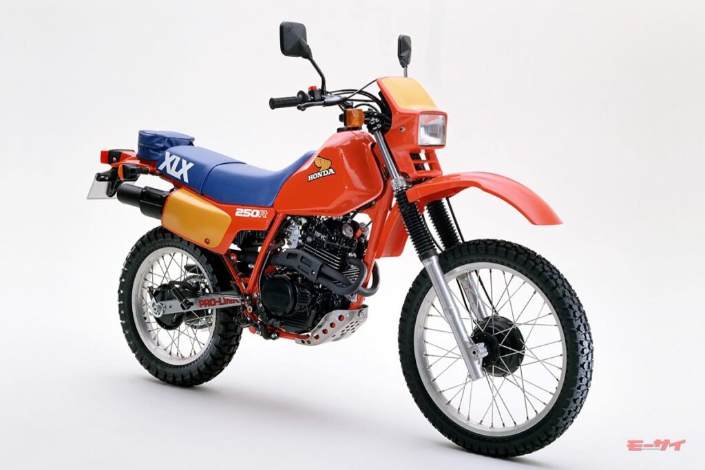 1983 XLX250R:シリーズ初のセミダブルクレードルフレームを採用。ボア×ストロークは72×61.3mmで、最高出力は26ps