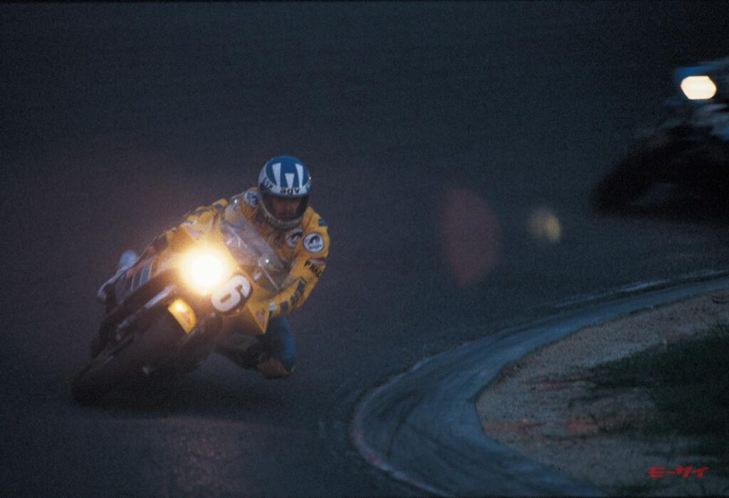 最初の犠牲になったのは、78/81年に優勝を飾っているホンダフランスのマイク・ボールドウィンで、以後、ヨシムラスズキのデビッド・アルダナ、カワサキフランスのジャン・クロード・シュマランといったベテラン勢も、次々と豪雨の餌食になっていく(前年の鈴鹿8耐を盛り上げたガードナーとクロスビーは、この年は不参加)。アメリカやヨーロッパでは、これほどの悪天候でレースを行うことはあり得ないのだから、それは当然のことであり、外国人ライダーの多くは借りてきた猫のような走りに徹することとなってしまった。