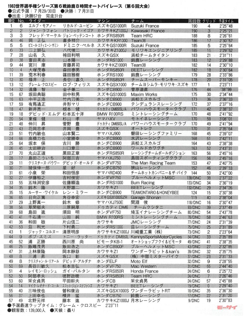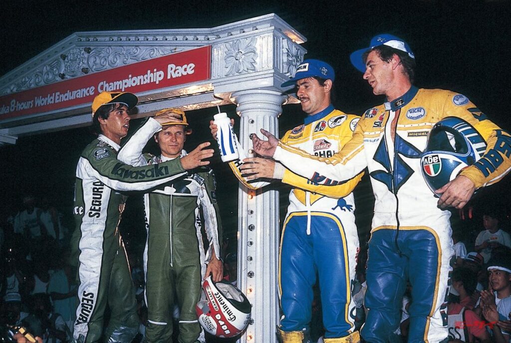 だが’83年の耐久チームには勢いがあった。序盤こそクロスビー/フィリスのヨシムラ&モリワキ車が先行したものの、2時間後にはラフォン/イゴアのカワサキ、モアノー/ユービンとサミン/ペルネのスズキが追いつき、4台でデッドヒートを展開。3時間後にはサミンが転倒してトップグループを離れたが(同じころにコルヌー/清原も転倒してリタイア)、後にエンジントラブルが発生したヨシムラ&モリワキ車をモアノー/ユービンとラフォン/イゴアがパスし、結局そのままの順位でチェッカーを受けることとなったのである。