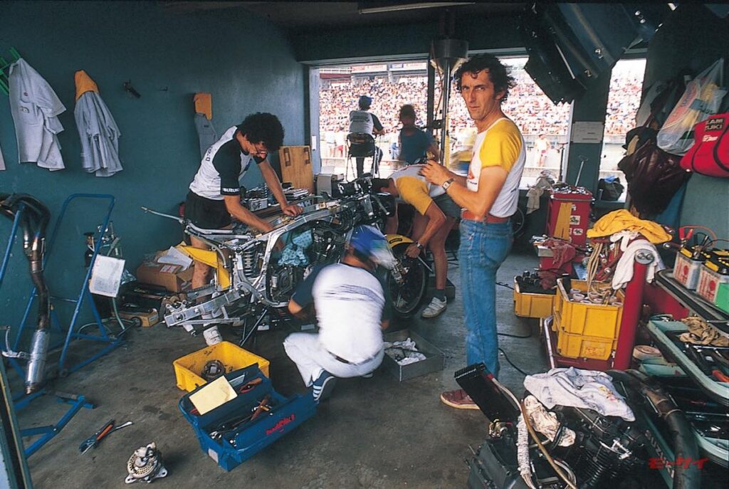■GS1000Rの整備を行うスズキフランスのピット。カメラ目線はSERTの発起人であるドミニク・メリアンで、彼はこのチームのボスを長く務めていた。 なお80年の創設当初はあくまでもレース運営だけを担当していたSERTだが、後に独自の活動を行うようになり、スズキ本社やヨシムラに提案をする機会も増えていった。05~06年には北川圭一がこのチームに所属し、日本人初の世界耐久チャンピオンを獲得している。
