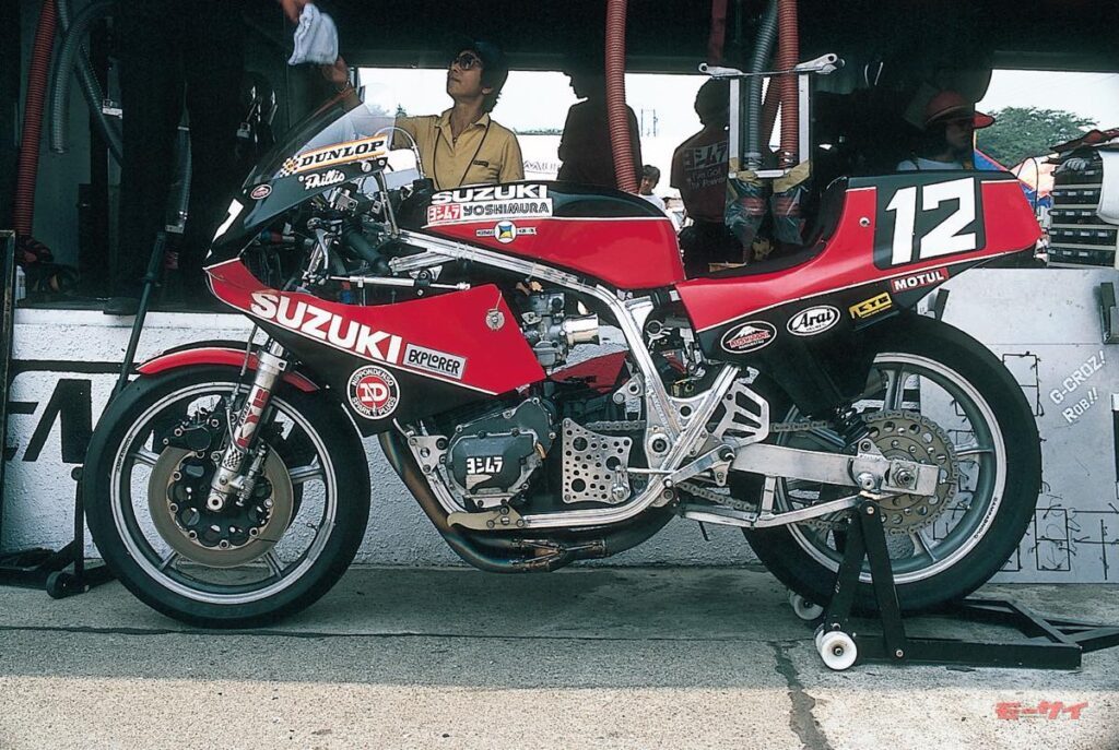 ■スズキのレース活動縮小によって、本社製フレームの供給を受けられなくなった83年のヨシムラは、創業者吉村秀雄(POPヨシムラ)の義理の息子である森脇 護が開発したアルミフレームを採用(リヤサスは後輪の滑り出しが分かりやすいという理由から、あえてツインショックを採用。 フロントホイールは当時の耐久でも流行していた16ではなく18インチ)。ヨシムラとモリワキの夢の競演に期待が高まったものの、決勝ではシリンダーヘッドからのオイル漏れに悩まされた。