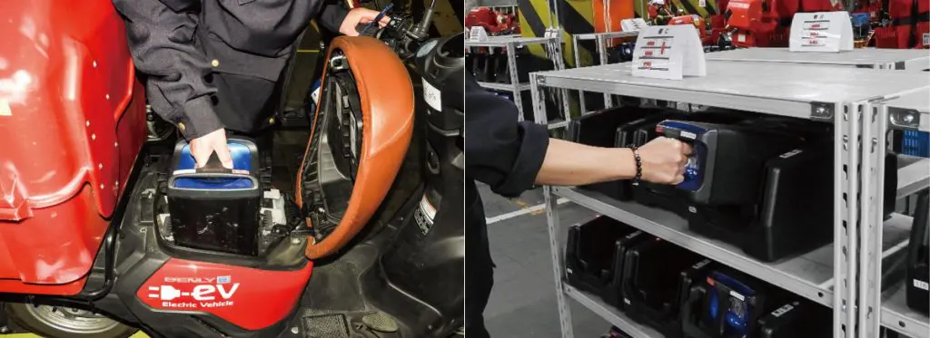 B/Tは約10㎏と重量感があるものの、B/T充電器が駐車スペースのすぐ横に設置されているため、慣れてしまえば特に気にならないとのことでした。また、充電器は電動バイク一台につき二個のB/Tを使用するため二基ずつ用意されており、戻ってきたときに充電器が使えないということにならぬよう配慮されています。