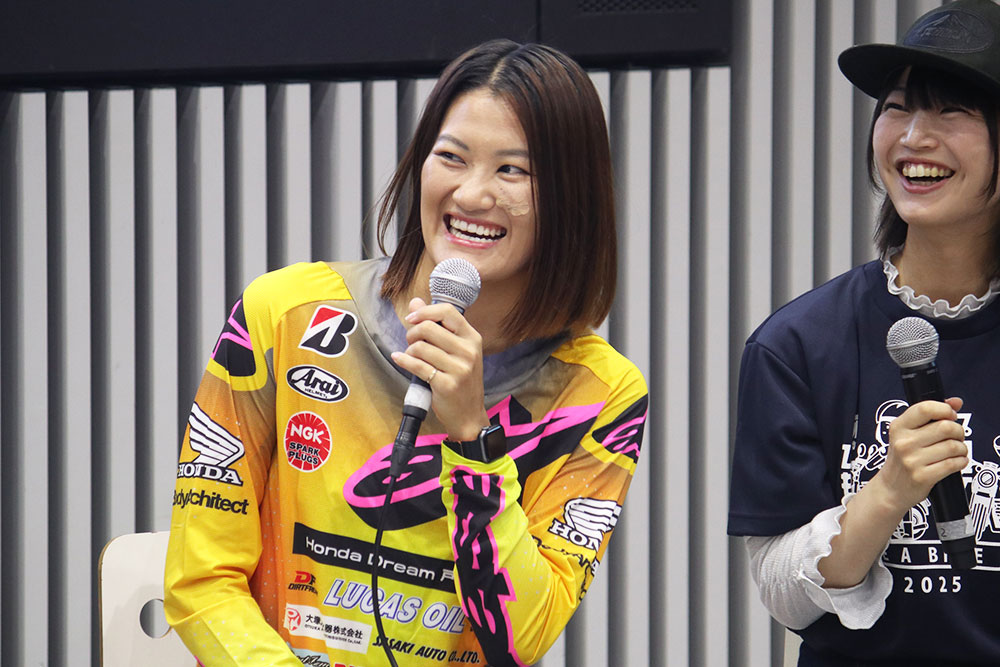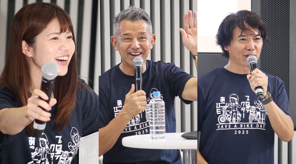 グループツーリングや初心者ライダーの公道デビューに話が及び、ライダー同士はもちろん、周囲を走るクルマのドライバーとのコミュニケーションの大切さや危険予測に対する心構えについて話され、軽快な語り口調ながら正しいことをしっかりと伝えられるお二人の話ぶりに、来場者は真剣に聞き入っていました。