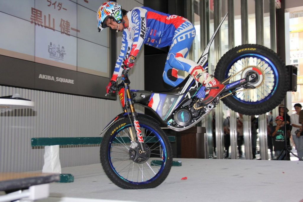 第一部 / 第二部それぞれで「電動トライアルバイクによるデモンストレーション」が実施されました。ヤマハの電動トライアルマシン「TY-E 2.2」に乗って颯爽と登場したのは、1995年からトライアル世界選手権に参戦して通算4度の勝利を収め、2023年からはTY-Eで全日本選手権国際Aスーパークラスに参戦、今期はランキングトップを走っている黒山 健一選手です。スタンディングからのウイリーやジャックナイフ、そして前後タイヤを使った風船割り、一本橋渡りなど、イベントステージに作られた特設スペースを活用してプロのテクニックを披露。軽妙なトークを交えながら会場を大いに盛り上げました。
