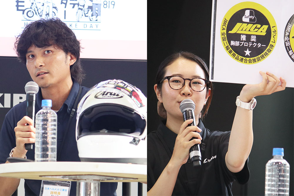 相神氏はヘルメットの規格の詳細から、ヘルメットのサイズに関する内容やあご紐をしっかり結ぶことの重要性、バイクの排気量ごとでのヘルメットの選び方について解説。神谷氏は昨年発表したヒョウドウプロダクツのエアバッグウエアについて、スタッフが着用しての実践とともに製品開発にかけるメーカーの想いを語られました。篠田氏からは、現在の胸部プロテクター着用率と新たに発売した最新プロテクターの魅力を伝え、今後の着用率向上へとつながるお話をしていただきました。