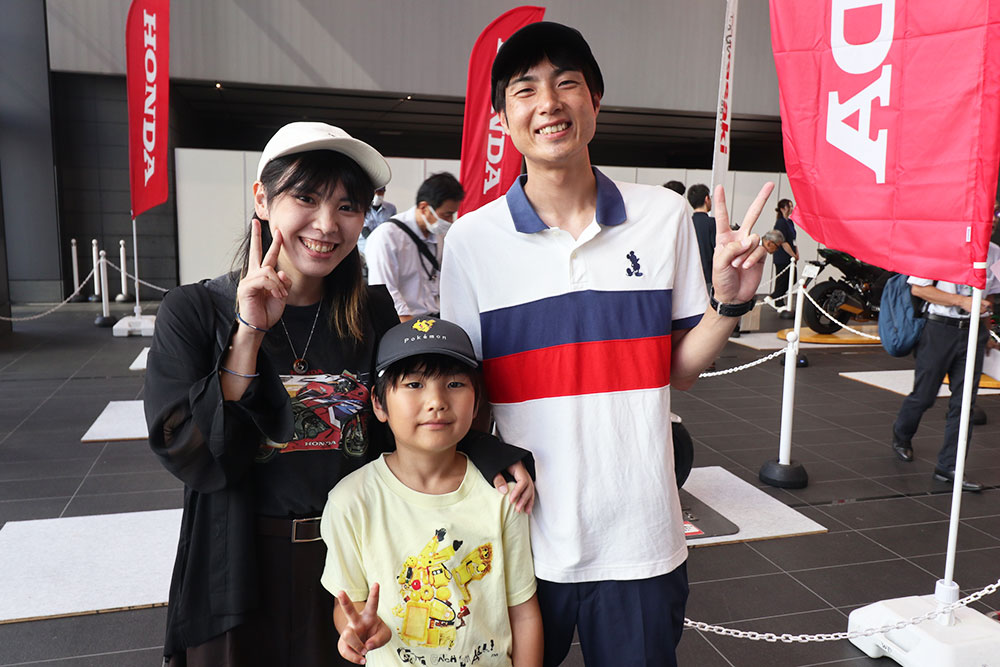 「ネットで『バイクの日』の情報を見つけて、息子が夏休みだったので家族で見に来ました。叔父の影響でホンダが大好きになって、我が家も全員ホンダが好きで、クルマとバイクはもちろんホンダです(バイクは『CBR1000RR』と『グロム』の2台所有)。息子の名前も、ホンダの創業者・本田宗一郎さんにあやかりました。この子もバイクが好きになってくれているので嬉しいですね。将来は自分の好きなバイクに乗って欲しいと思います」(村田 ショウゴさん)