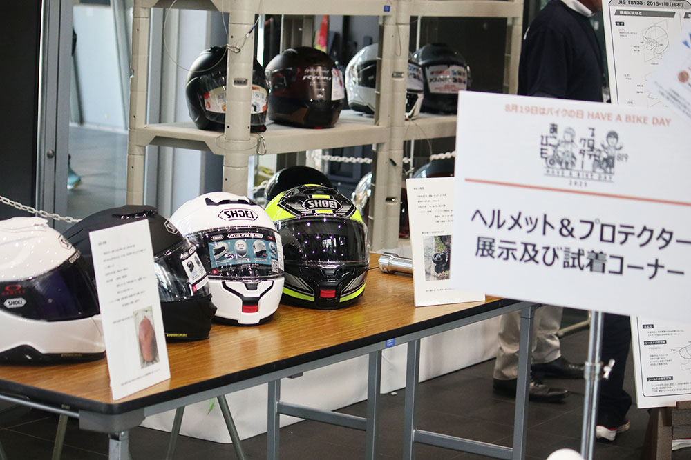 ライダーの必需品であるヘルメットの安全性やPSC基準の管理を受け持っている一般社団法人 日本ヘルメット工業会(以下、ヘルメット工業会)と、ライディングウエアやプロテクターを取り扱う一般社団法人 全国二輪車用品連合会(以下、全国二輪車用品連合会)の会員であるアールエスタイチとヒョウドウプロダクツの2社が今回ブース出展しました。こちらのブースではタイプやサイズが異なるヘルメットと、最新のバイク用エアバッグベストやプロテクター入りライディングウエアが用意され、自分のサイズに合った防具を適正着用することの大切さを体感することができました。