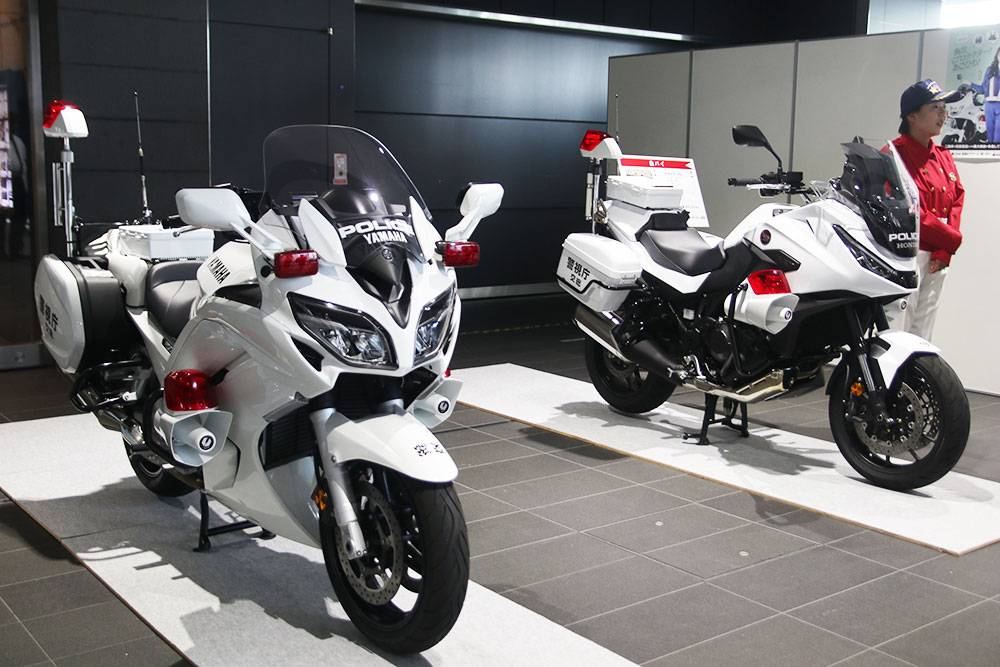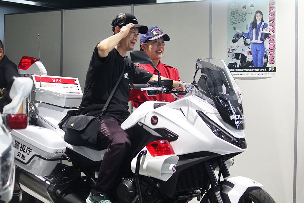 国内バイクメーカー4社の最新バイク展示コーナーと肩を並べる人気を集めたのが警視庁ブースです。今回は日々のパトロールやマラソン大会の先導車としても活躍するYAMAHA FJR1300P(左)と、今年よりHonda CB1300Pの後継車として新たに採用されたHonda NT1100Pの2台が並びました。憧れの白バイに跨れることから、大人から子どもまで目を輝かせながら列をなし、白バイ隊員の気分を味わっていました。