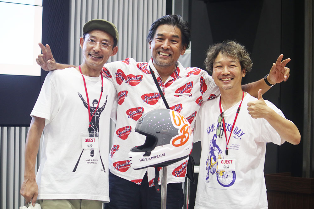 見事にヘルメット引き当てた方は、ステージにて加藤さん、増永さんと一緒に記念撮影
