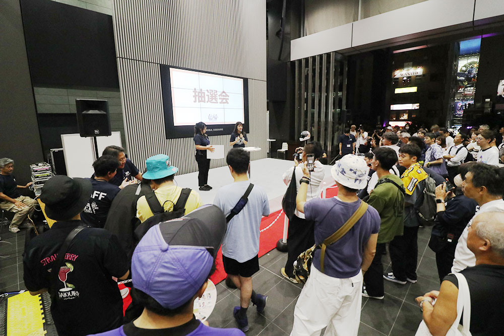 第一部・第二部それぞれの最後に、バイクグッズが当たる抽選会が行われました。第二部では、先ほど完成したばかりのスペシャルペイントヘルメットも賞品になるということで、MCの梅本さんが読み上げる数字に一喜一憂する姿が見られました。