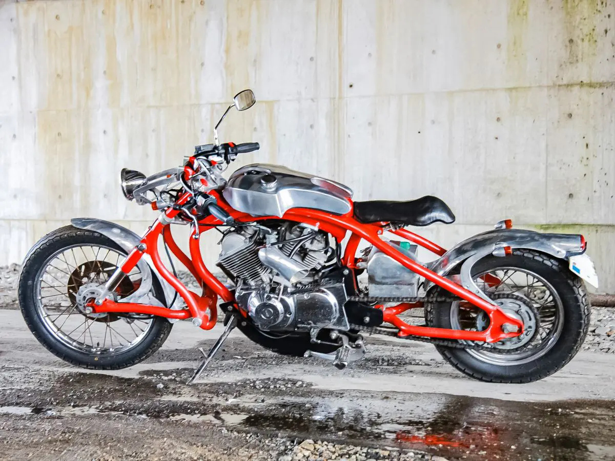 エンジンこそ既存モデルを流用していますが、なんとフレームはしっかりと走行できるようにホイールベース、ホイールトラベル、車体のディメンションなどすべて計算して設計されたというのだから驚きです。しかも材料の切り出しから、曲げ、溶接、塗装の全工程を全てご自身で行ったといいます。